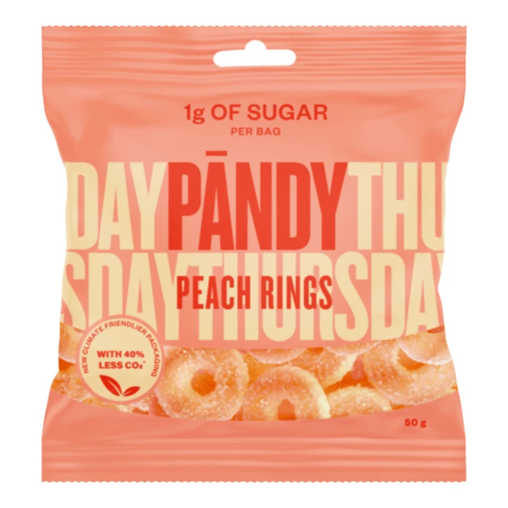 Jemné cukrové kroužky z pěny a želé s příchutí sladké broskve, bez přidaného cukru.