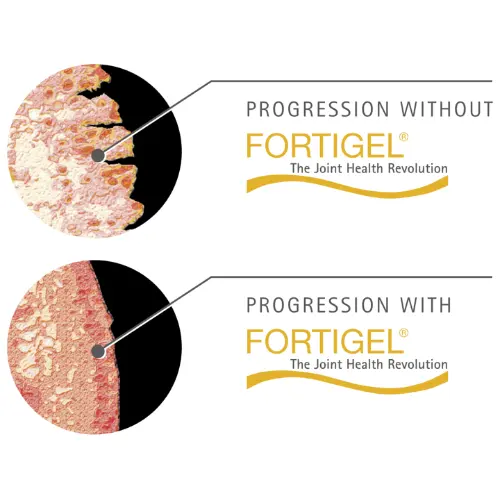 Homogenní směs certifikovaného kolagenu s bioaktivními peptidy FORTIGEL® (u nichž byla vědecky ověřena účinnost), glucosaminu, L-carnitinu, chondroitinu a vitamínu C napomáhá: