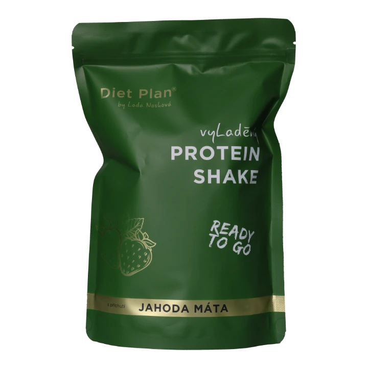 Nápoj s vysokým obsahem bílkovin s příchutí jahoda máta, se sladidly přírodního původu z rostliny stévie a sušeným mlékem.
