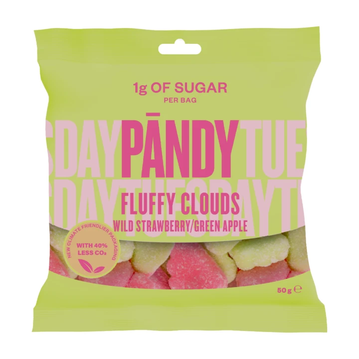 Pěnové bonbony bez přidaného cukru s příchutí lesních jahod a zeleného jablka.